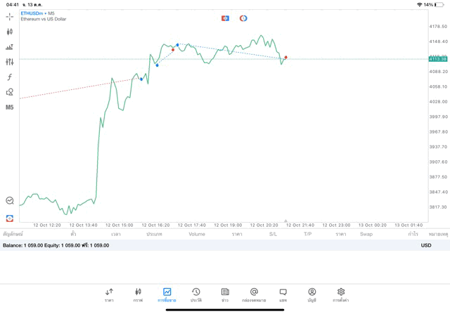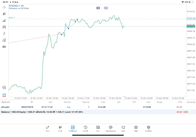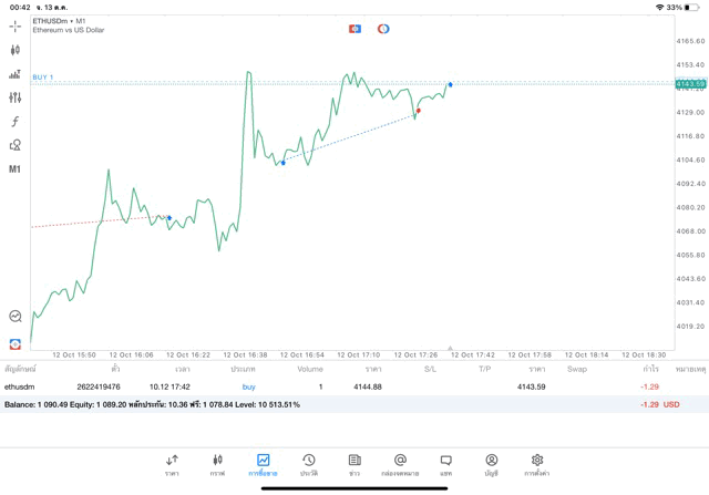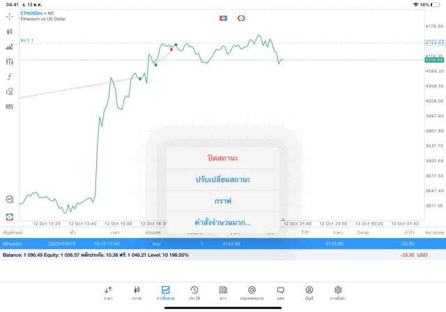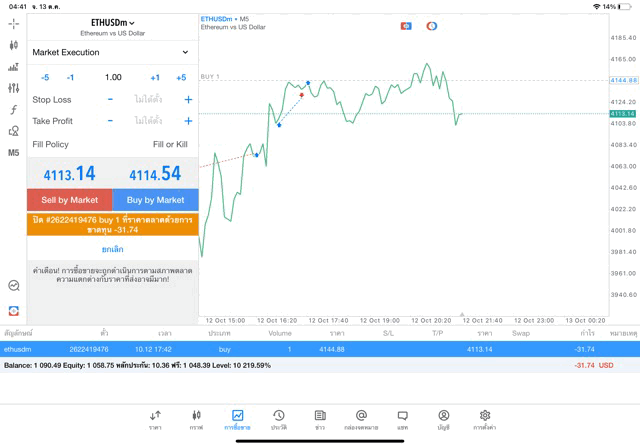 การเทรด Crypto ETHUSD 1.00 lot แอพ MT5