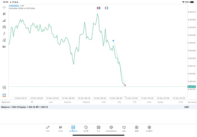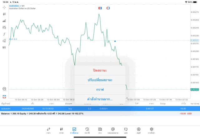 คลิ๊กค้างบน AUDUSDm ที่เพิ่มมาบนหน้าแรก แล้วเลือก กราฟ เปิดกราฟราคา AUDUSDm วิเคราะห์ราคา แล้วคลิ๊กปุ่ม + บนแผงเมนูด้านข้าง เปิดหน้าต่างส่งคำสั่งซื้อขาย