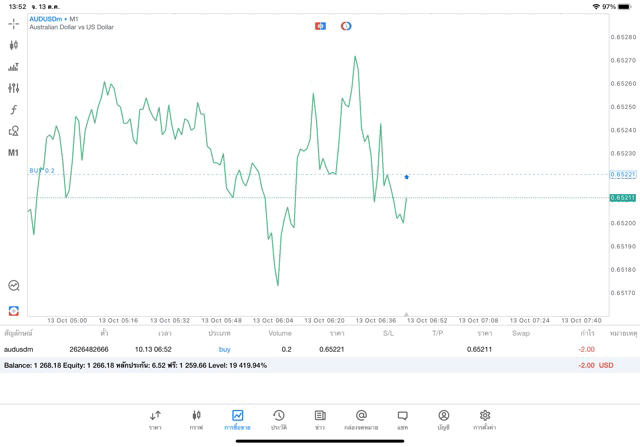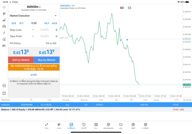 การเทรด Forex AUDUSDm 0.2 lot แอพ MT5