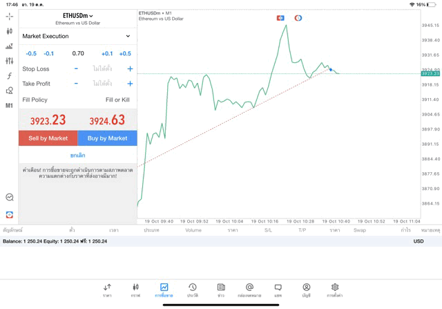 คลิ๊กค้างบน ETHUSD จากแผงรายชื่อหุ้นที่เพิ่มขึ้นบนหน้าแรก เลือก เปิดกราฟ ETHUSD แล้วคลิ๊กปุ่ม +สีน้ำเงินแดง บนแผงเมนูด้านข้าง เมื่อหน้าต่างส่งคำสั่งเทรดเปิดขึ้น กรอกจำนวน lot เช่น 0.7 ตามภาพด้านล่าง เลือกทำกำไร ETHUSD ได้ทั้งขาขึ้นหรือลง โดยเลือก คลิ๊กปุ่ม Buy by market หรือ Sell by market