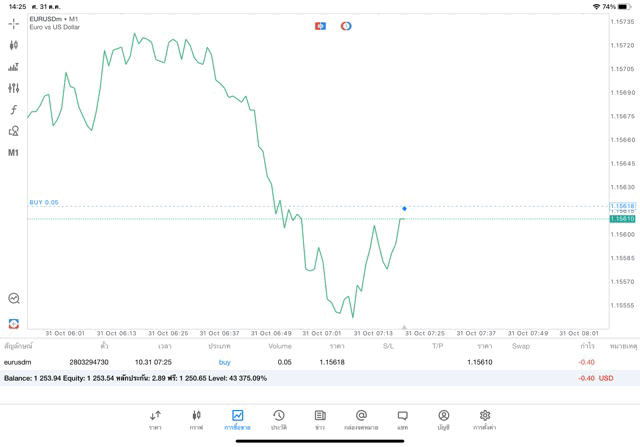 การเทรด Forex EURUSDm 0.05 lot แอพ MT5