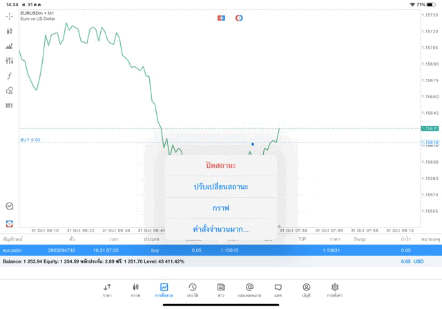คลิ๊กค้างบน EURUSD ที่เพิ่มมาบนหน้าแรก แล้วเลือก กราฟ เปิดกราฟราคา EURUSD วิเคราะห์ราคา แล้วคลิ๊กปุ่ม + บนแผงเมนูด้านข้าง เปิดหน้าต่างส่งคำสั่งซื้อขาย