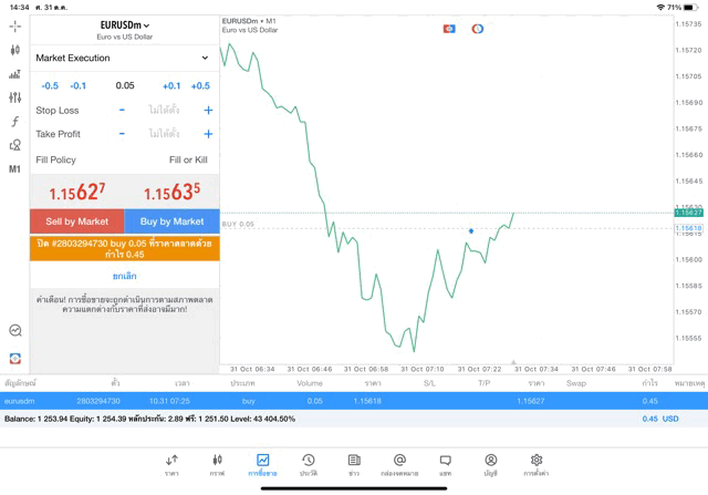 กรอกจำนวน lot เช่น 0.05 ลงในหน้าต่างส่งคำสั่งซื้อขาย เลือกทำกำไรได้ EUR แลกเปลี่ยน USD ได้ทั้งขาขึ้นหรือลง โดยเลือก คลิ๊กปุ่ม Buy by market หรือ Sell by market
