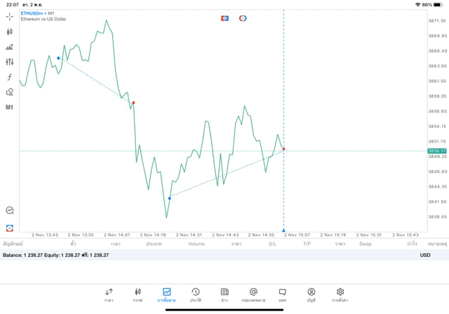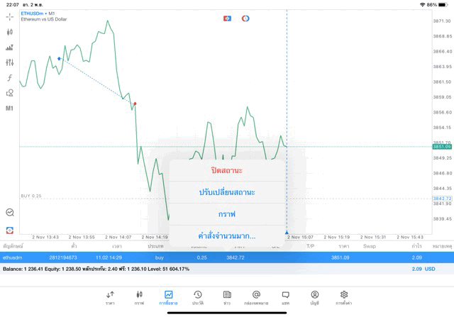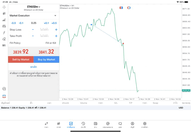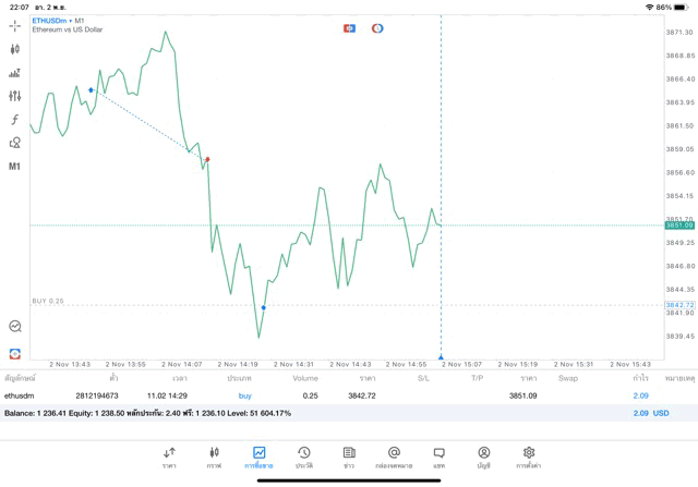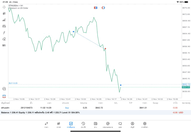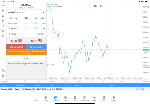 การเทรด Crypto ETHUSD 0.25 lot แอพ MT5