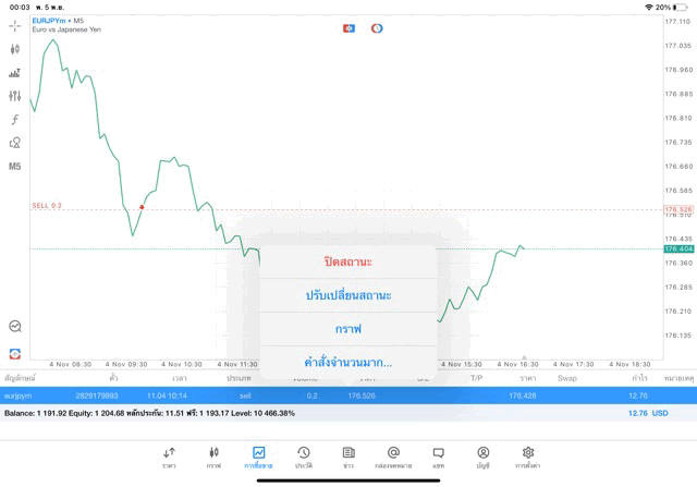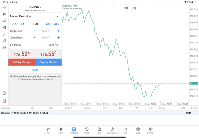 คลิ๊กค้างบน EURJPYm ที่เพิ่มมาบนหน้าแรก แล้วเลือก กราฟ เปิดกราฟราคา EURJPYm วิเคราะห์ราคา แล้วคลิ๊กปุ่ม + บนแผงเมนูด้านข้าง เปิดหน้าต่างส่งคำสั่งซื้อขาย