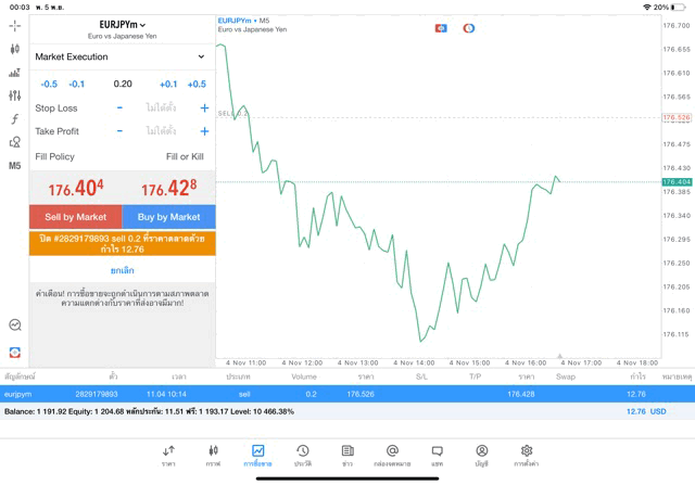 กรอกจำนวน lot เช่น 0.2 ลงในหน้าต่างส่งคำสั่งซื้อขาย เลือกทำกำไรได้ EUR แลกเปลี่ยน JPY ได้ทั้งขาขึ้นหรือ ลง โดยเลือก คลิ๊กปุ่ม Buy by market หรือ Sell by market