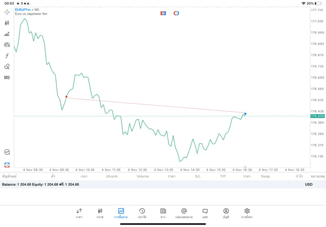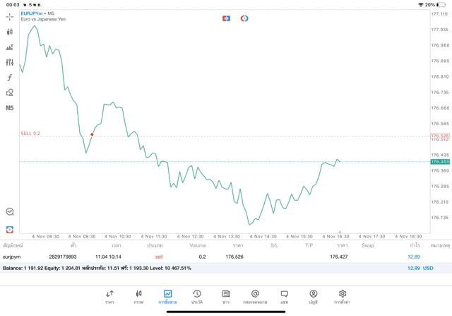 การเทรด Forex EURJPYm 0.2 lot แอพ MT5