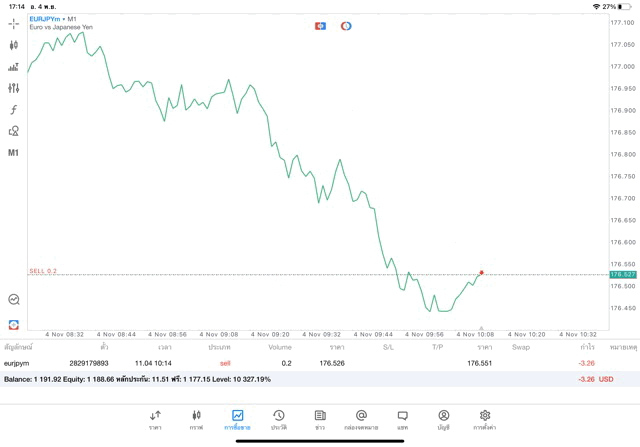 การเทรด Forex EURJPYm บน แอพเล่นหุ้น MT5 เริ่มขึ้นแล้ว ติดลบก่อนนะ เมื่อเริ่มต้นเทรด เมื่อเวลาผ่านไป ผลการลงทุนอาจจะกลับไปบวก หรือ อาจติดลบเพิ่มขึ้น อาจได้กำไร มาก น้อย หรือ ขาดทุน มาก น้อย EURJPYm หมายถึง เงินยูโร (EUR) แลกเปลี่ยน เงินเยนญี่ปุ่น (JPY) ส่วน m ต่อท้ายหมายถึง บัญชีนี้เป็นบัญชีเทรดแบบ Standard exness