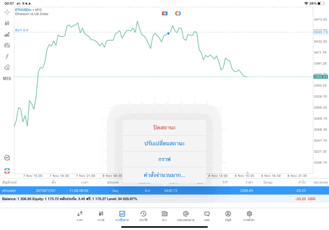 คลิ๊กค้างบน ETHUSD จากแผงรายชื่อหุ้นที่เพิ่มขึ้นบนหน้าแรก เลือก เปิดกราฟ ETHUSD แล้วคลิ๊กปุ่ม +สีน้ำเงินแดง บนแผงเมนูด้านข้าง เมื่อหน้าต่างส่งคำสั่งเทรดเปิดขึ้น กรอกจำนวน lot เช่น 0.4 ตามภาพด้านล่าง เลือกทำกำไร ETHUSD ได้ทั้งขาขึ้นหรือลง โดยเลือก คลิ๊กปุ่ม Buy by market หรือ Sell by market
