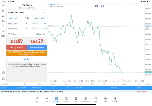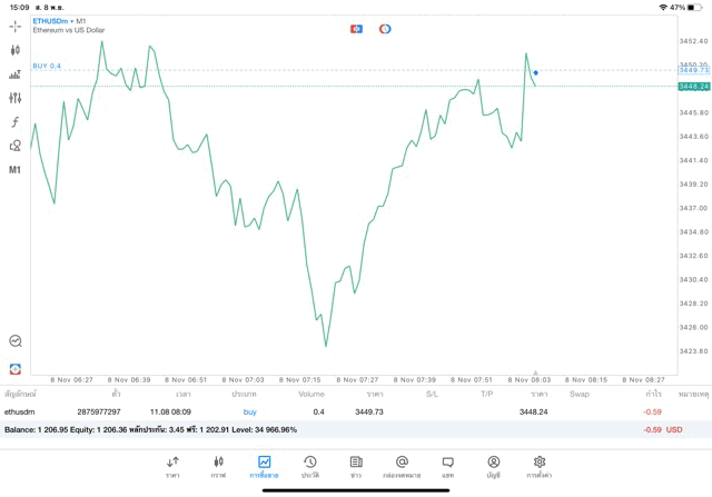 การเทรด Crypto ETHUSD 0.4 lot แอพ MT5