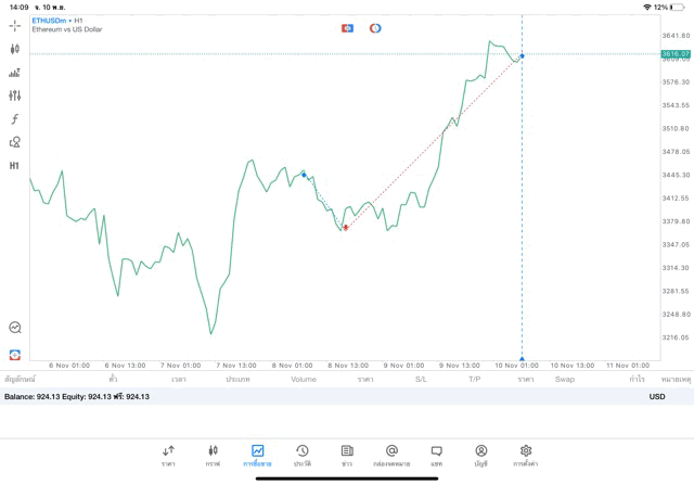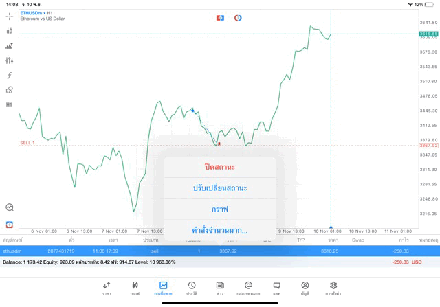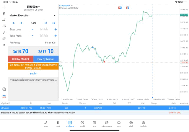 การเทรด Crypto ETHUSD 1.00 lot แอพ MT5