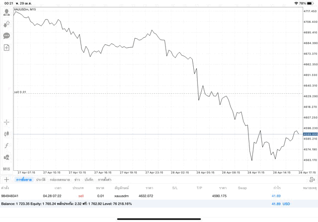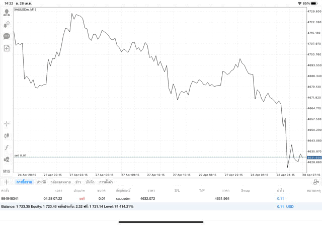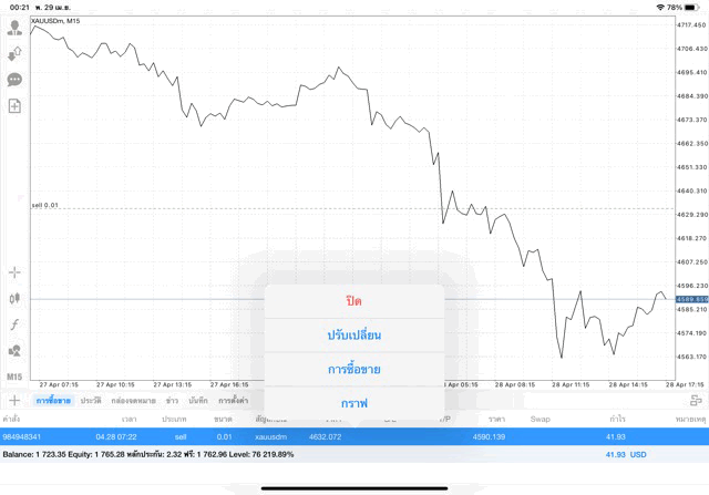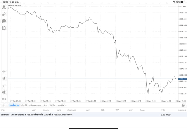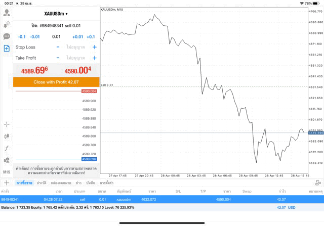 การเทรด XAUUSDm (ทองคำ) 0.01 lot แอพ Mt4